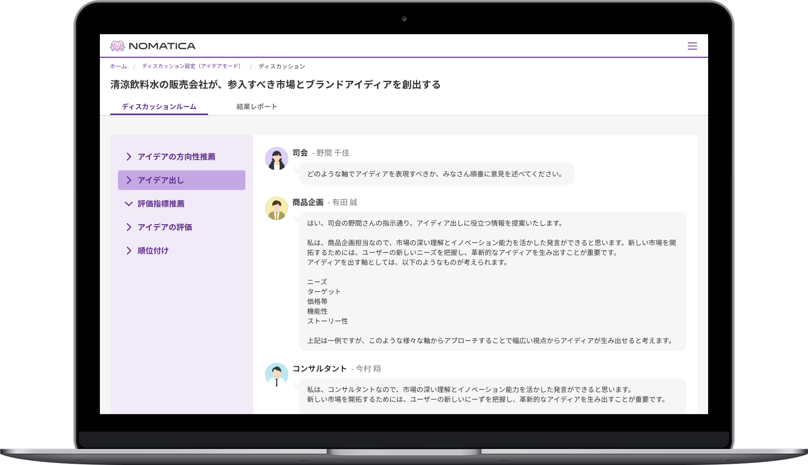 一般的な生成AIツールが単一の視点で回答するのに対し、Nomaticaは複数のAIエージェントが連携し、異なる視点や専門性をもとに意見を出し合います。